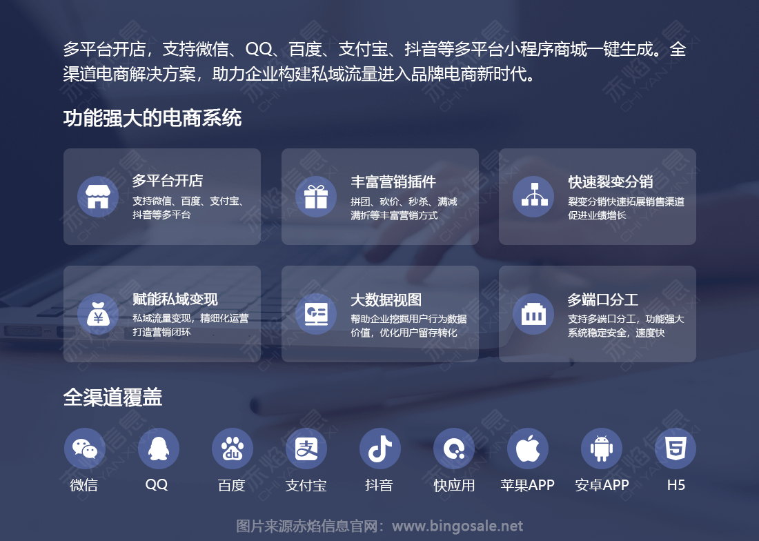 多平臺開店,支持微信、QQ、百度、支付寶、抖音等多平臺小程序商城一鍵生成。全渠道電商解決方案,助力企業構建私域流量進入品牌電商新時代。